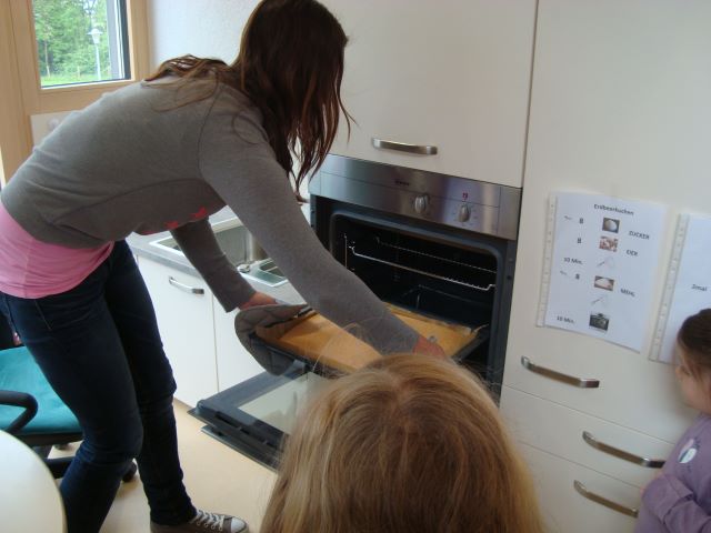 Die Ganztagskinder treffen sich zum warmen Mittagessen im Speiseraum, danach ruhen die Größeren bei einer guten Geschichte oder einer Hörspiel-CD und die Kleinen schlafen im abgedunkelten Schlafraum auf Schlafmatten. - Nachmittags: