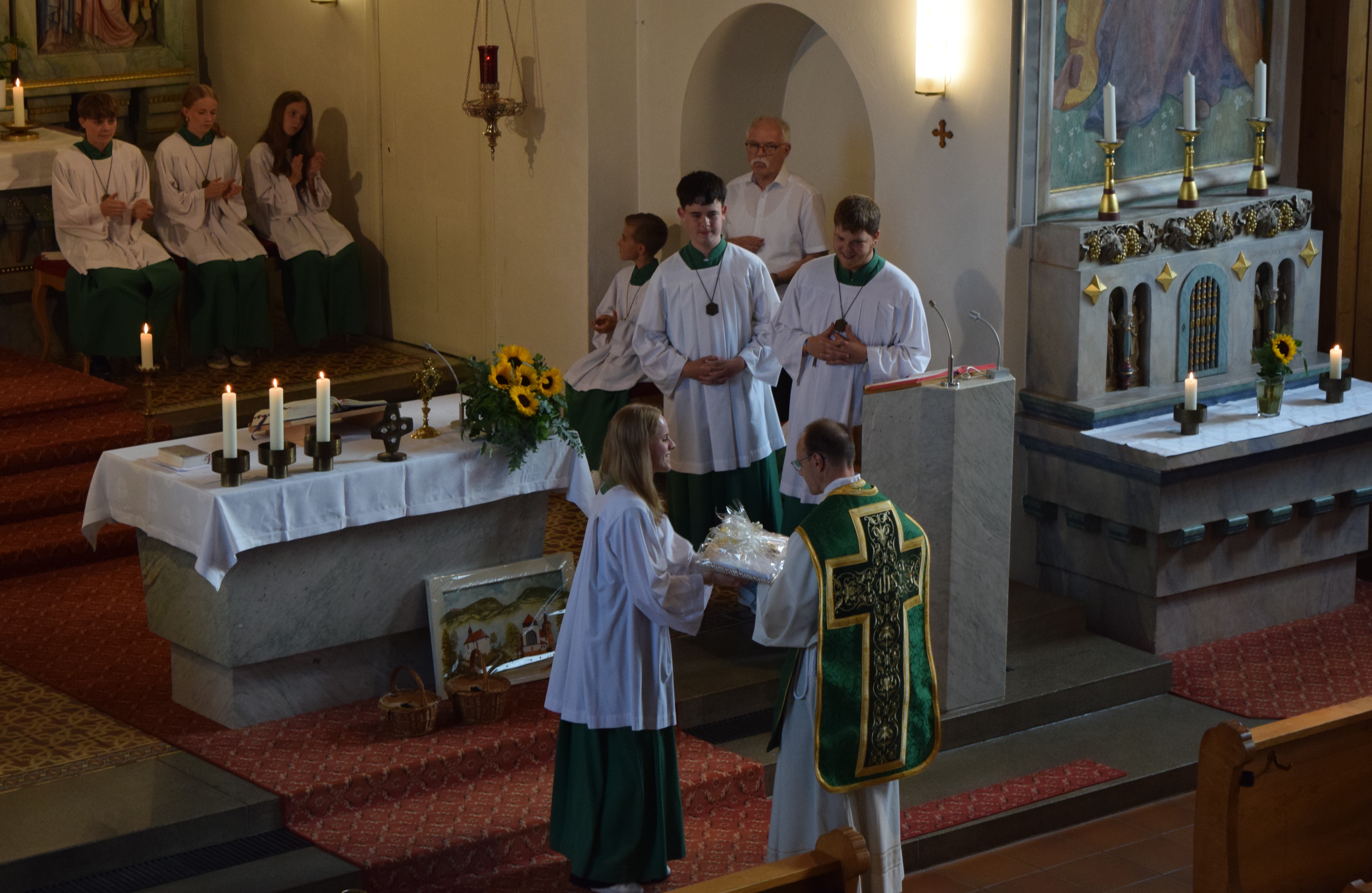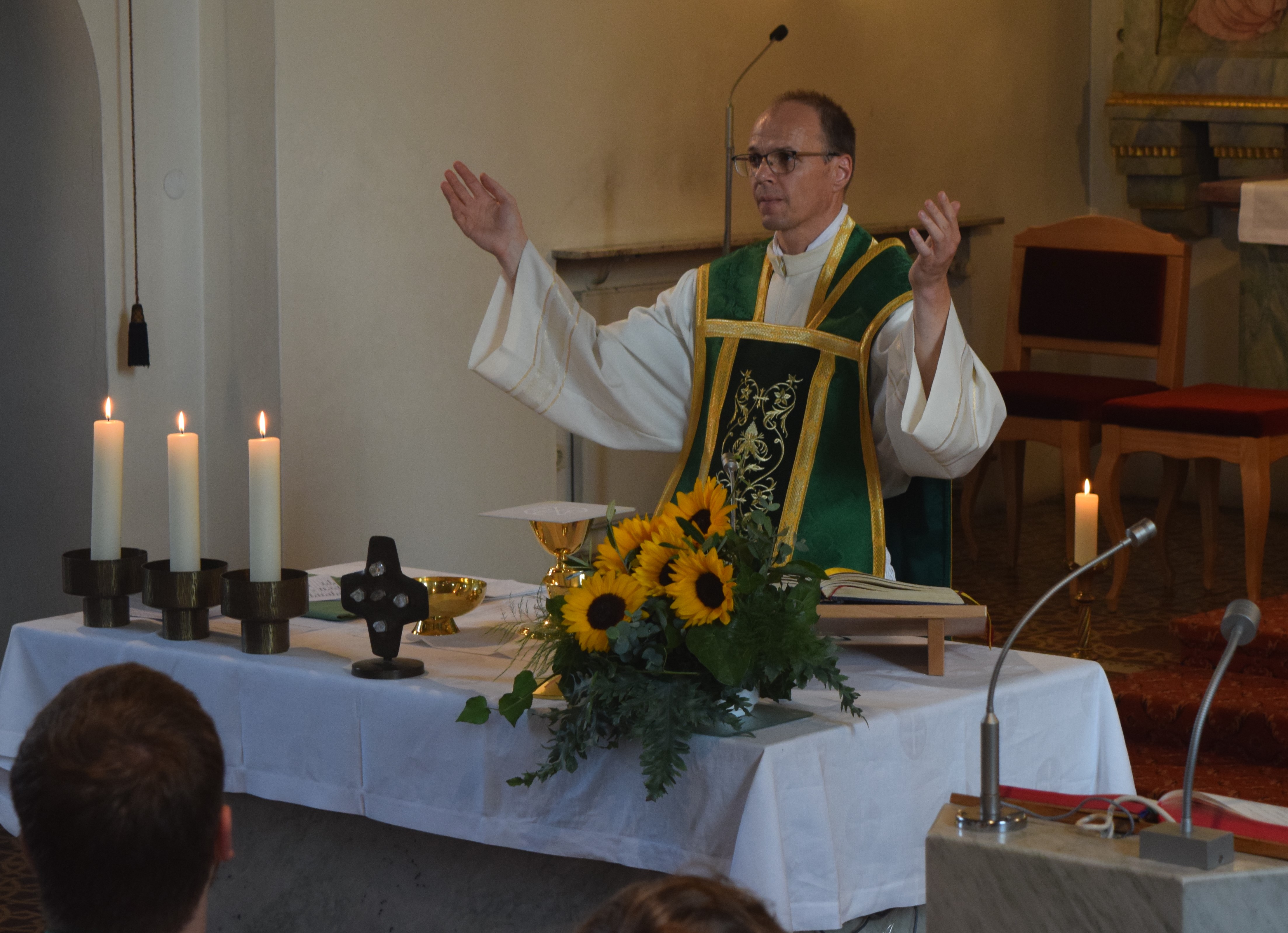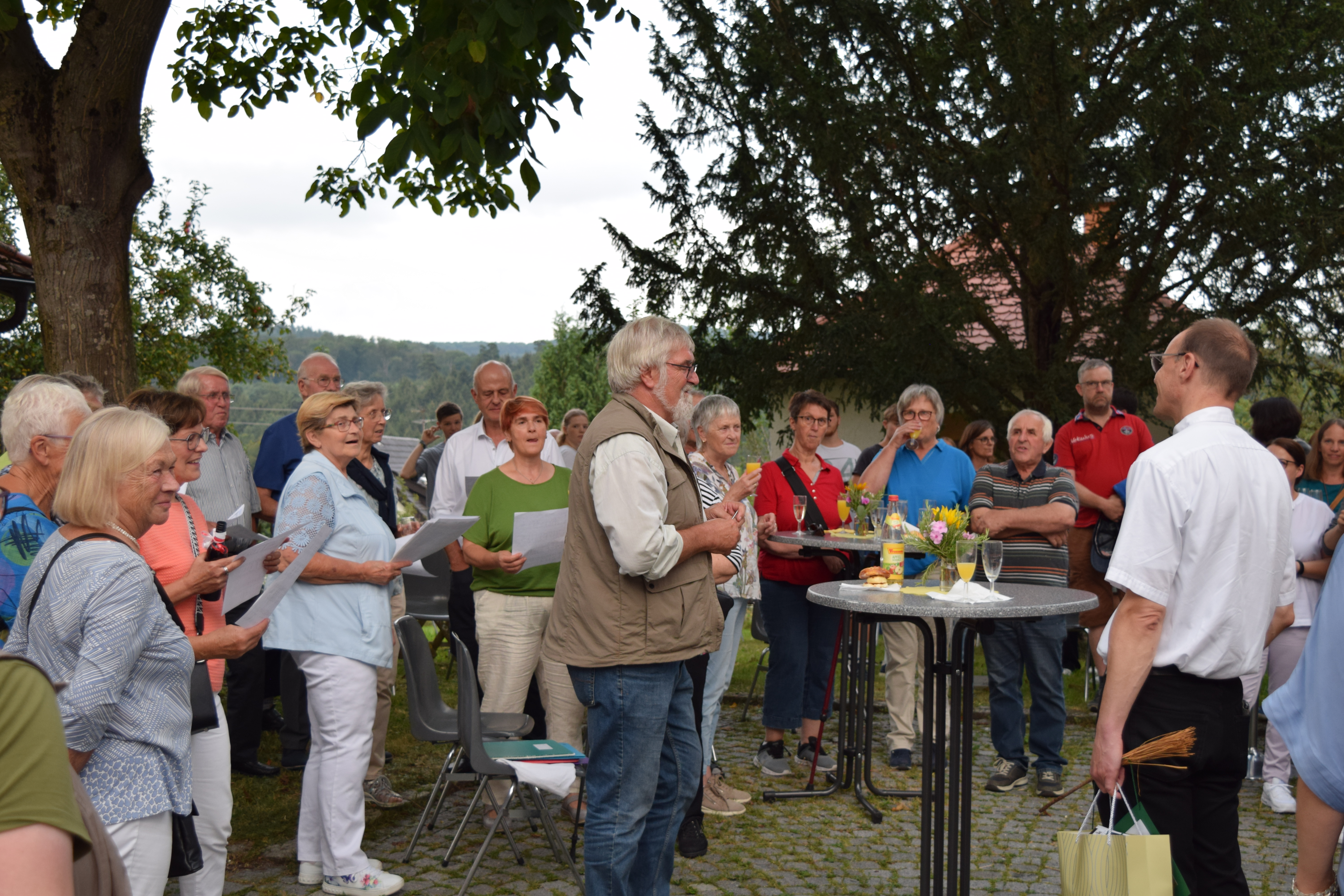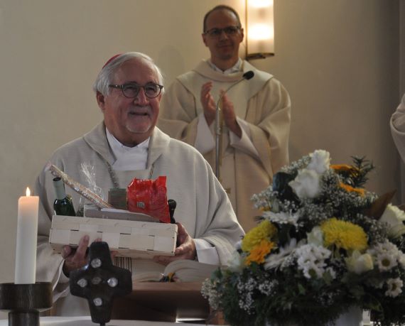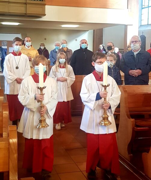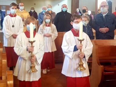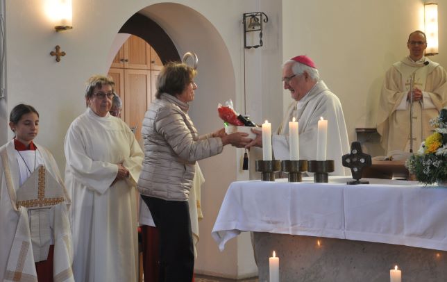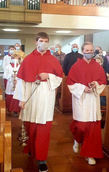 Leider konnte auf Grund der jetzigen Situation das Pontifikalamt mit Bischof Dr. Gebhard Fürst nicht wie vorgesehen stattfinden. Bischof Fürst hat jedoch seinen Besuch für das kommende Jahr zugesagt. Trotzdem fand ein festlicher Gottesdienst statt, den Pfarrer Braun zelebrierte. Die Messe wurde von einer Schola des kath. Kirchenchors, Stefan Feifel an der Orgel sowie Cornelia Schultes musikalisch umrahmt. In einer kurzen Ansprache überbrachte Herr Bürgermeister Rembold die Glückwünsche der Gemeinde sowie der Ortsvorsteherin Frau Schneider.